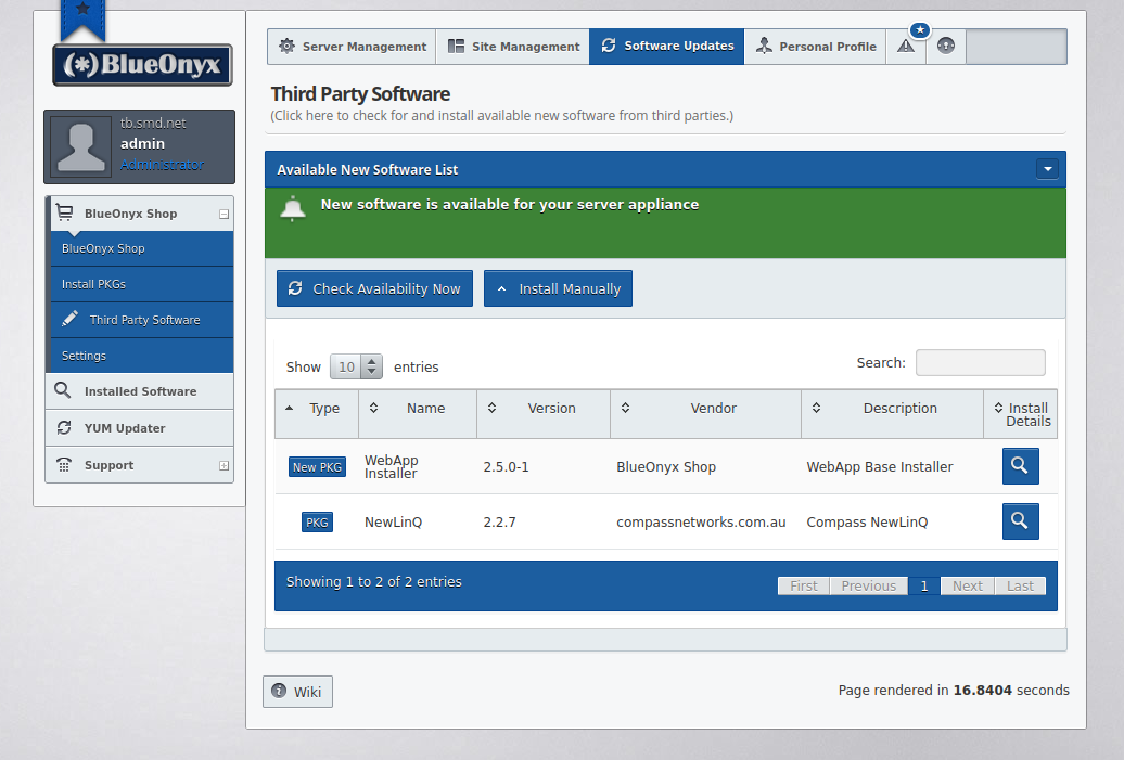 You can now install your applications on your server. You will be able to download and install any new packages that were released since your last update. You can do so via the "Third Party Software" menu. You may have to click on the "Check Availability Now" button to refresh the list of available software.