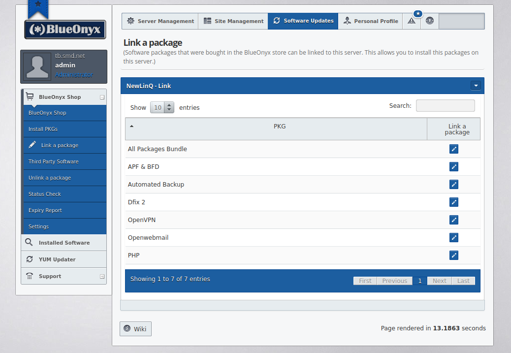 Once you have entered valid BlueOnyx shop login details, you can link your purchases to this server via the "Link package" menu: